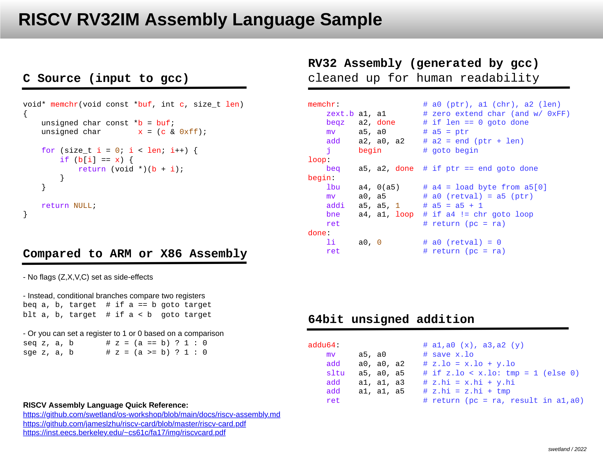 These are some slides I put together for an informal workshop on bare metal programming, bringup, and OS programming, illustrating some of the key points of the RV32 Architecture.
